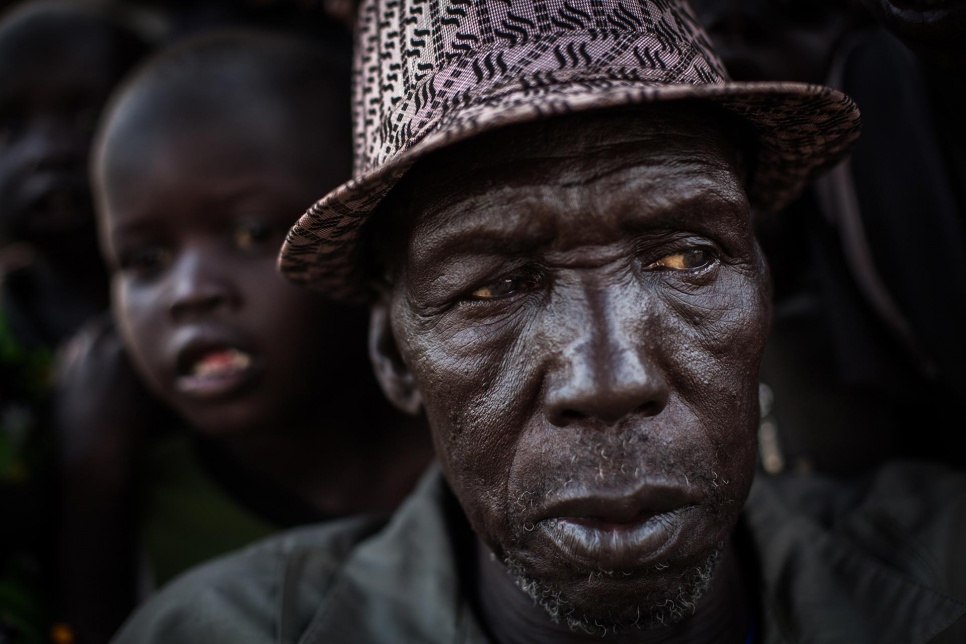 But the respite was brusque-lived. In the past year, fresh conflict between supporters of rival politicians in the world'due south newest country has forced almost one in every five of this nation'south 11 million people from their homes. Almost half a million of the displaced have become refugees in neighbouring countries. Many more than – 1.iv 1000000 – have fled to other areas within South Sudan's borders. Now, older people live in stick-and-tarpaulin huts with their children, and their children's children, all three generations – sometimes four – far from home due to yet more state of war.